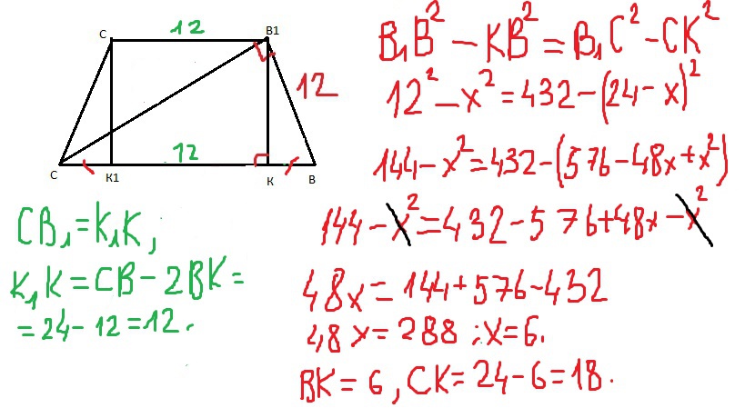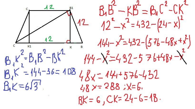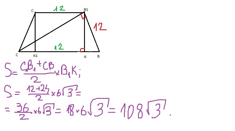 Площадь трапеции равна: (C1B1 + CB)*B1K/2, S = (12 + 24)*6*sqrt(3)/2, S = 36*6*sqrt(3)/2 = 18*6*sqrt(3) = 108*sqrt(3).