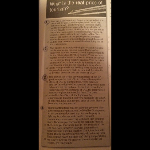 туризм - крупнейшая и наиболее быстроразвивающаяся отрасль промышленности в мире. в 2020 1,6 миллиона (или миллиарда - одинаковые слова) будут проводить выходные зарубежём, в основном на самолёте. Увеличение полётов ведёт к увеличению загрязнений, особенно выброс углекислого газа. СО2 - газ и галвная причина изменения климата. Например (Чтоб дать пример) полёт туда и обратно Лондон-НьюЙорк создаёт 1.22тонн газа на каждую персону (наверное имеется ввиду каждый пасажир самолёта). Помножте это на число людей летающих во всём миреи легко увидеть ужасный эффект , который полёты имеют на окружающую среду