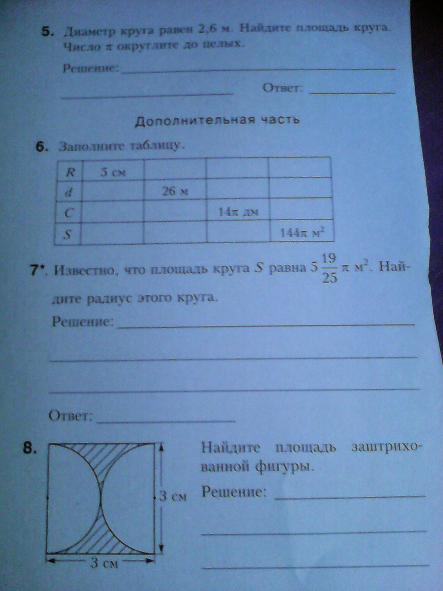 3)С=3,14*2,7=8,478 см; ///4)2*3,14*15=94,2 мм длина окружности; 94,2:4=23,55 мм длина дуги окружности; //(2 лист)5)1/4*3*(2,6^2)=0,25*3*6,76=5,07м^2 площадь круга;