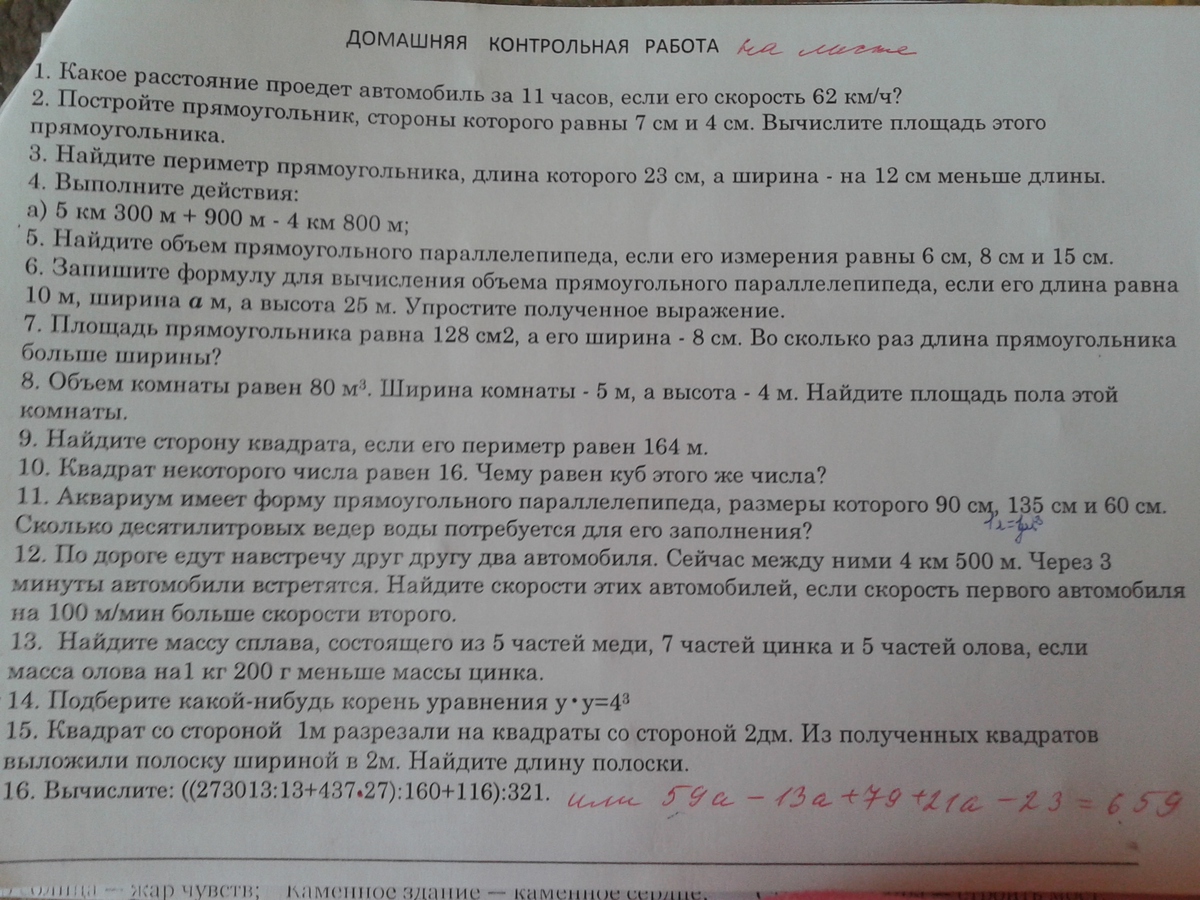 1. 62×11=682(км)-проедет автомобиль за 11 ч. 2. S=7×4=28(см В квадрате). 3. 1) ширина: 23-12=11(см); 2) Р=2(23+11)=68(см). 4. а)5км300м+900м-4км800м=5300+900-4800=1400(м)=1км 400м. 5. V=6×8×15=720(см в кубе). 6.V=10×a×25=250×a(см в кубе). 7. S=a×b; a=S:b=128:8=16см -это длина. 16:8=2(р)-В два раза длина больше ширины. 8. 1)80:(5×4)=4(м)-длина комнаты; 2) 4×5=20(м в квадрате)-площадь пола. 9. Р=4×а ;а=164:4=41(см)-сторона квадрата. 10. х^2=16; х=2; 2^3=8 (^2-в квадрате; ^3-в кубе). 11. 1)V=90×135×60=729000(см в кубе)=729л ;2) 729:10=72полных ведра и 900мл. 13. пусть 1 часть это х,тогда медь-5х;цинк-7х; олово-5х. 7х-5х=1200; 2х=1200; х=1200:2=600(гр); (5+7+6)×600=10200гр=10кг 200гр-масса сплава. 12.пусть х(м/мин)-скорость 1 автомоб; х-100(м/мин)-ск 2автомоб. (х+х-100)×3=4500; 6х-300=4500; 6х=4800; х=4800:6=800м/мин=48(км/ч); 800-100=700(М/мин)=42(км/ч). 14.у×у=4^3; у×у=64; у=8. 16. 59а-13а+79+21а-23=659; 67а=659-56; 67а=603; а=603:67=9. 15. 1м=10дм; 10:2=5; 2м=20дм; 20:5=4дм=4м