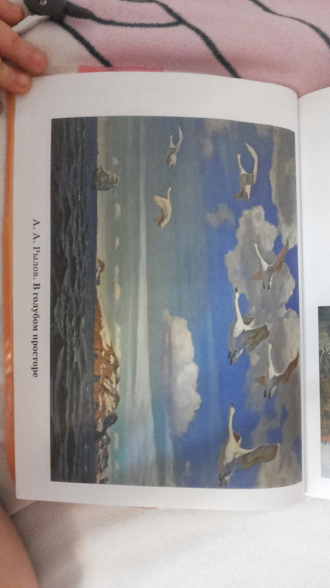Ясный летний день, солнце высоко в небе, его лучи слепят глаза. На картине изображен бескрайний простор, огромное бездонное синее небо, темное блестящее море, вода в нем переливается под яркими лучами солнца, дует теплый ветер, от этого волны бушуют в море, на их гребнях появилась белая пена. Все полотно картины занимают небо и море. По голубому небу летит стая лебедей. Лебеди летят к солнцу, в теплые края. Солнце освещает их широкие крылья, птицы летят уверенно и свободно по направлению к своей цели. Рядом с ними также быстро летят пушистые легкие перистые облака, они напоминают легкие перышки, которые витают в воздухе. По морю плывет корабль, развеяв свои паруса, он летит по волнам. Его белые паруса, как будто горят под солнечными лучами. На заднем плане мы видим горы, они окутаны снегом, а облака касаются макушек гор. От картины веет соленым и свежим бризом. Главные цвета картины это синий и белый, темно-синим цветом изображается море, а светлым небо, плавный переход цвета отлично передает атмосферу, которую хочет передать художник.