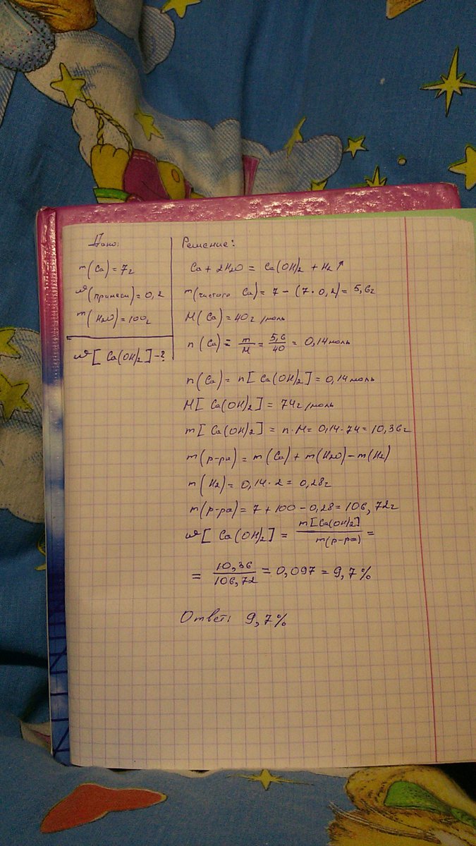 7 ГРАММОВ ТЕХНИЧЕСКОГО КАЛЬЦИЯ, СОДЕРЖАЩЕГО 20% ПРИМЕСЕЙ РАСТВОРИЛИ В 100 граммов ВОДЫ. ОПРЕДЕЛИТЕ МАССОВУЮ ДОЛЮ ГИДРООКСИДА КАЛЬЦИЯ В ПОЛУЧЕННОМ РАСТВОРЕ!