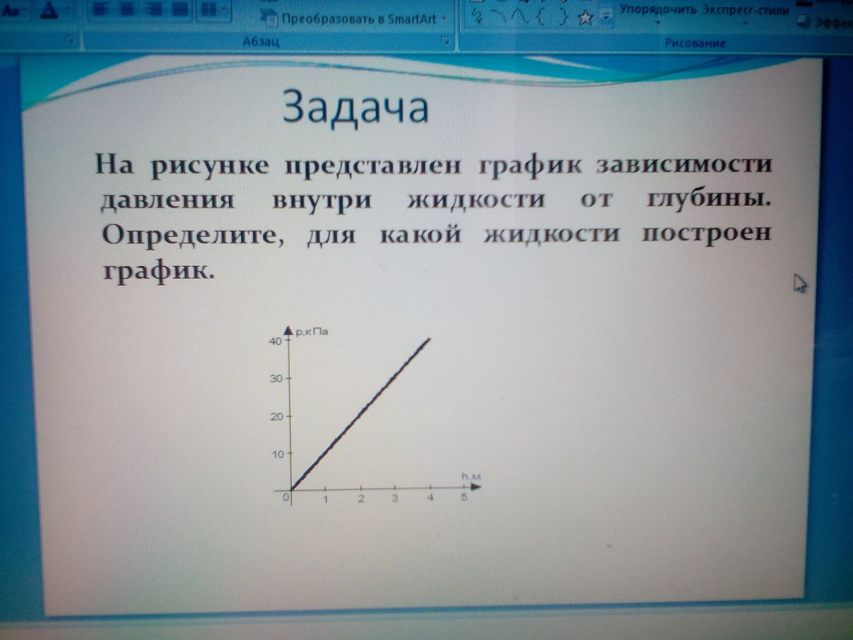 Делишь давление на глубину (возьмем давление 40кПа и глубину 4м), получаешь плотность х 10 (ускорение свободного падения)