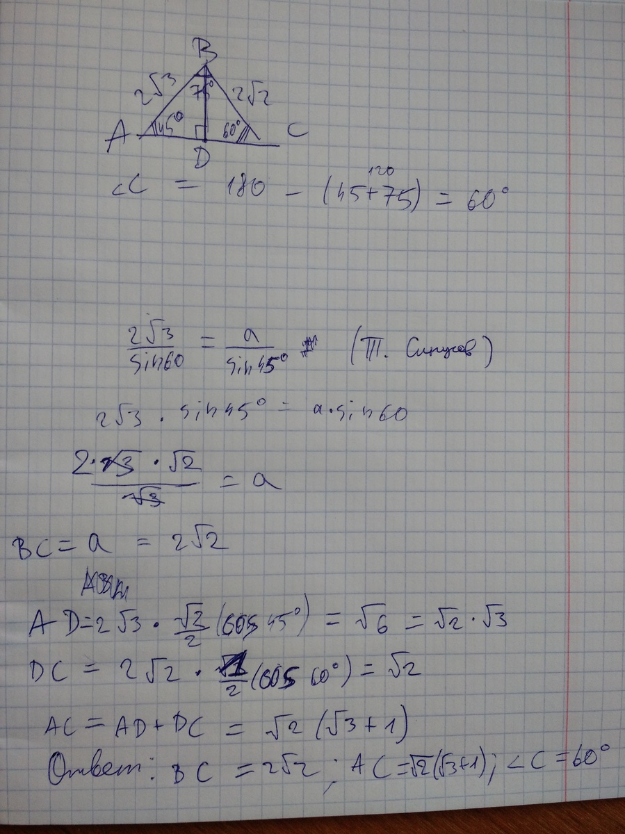 треугольник АВС;АВ=2√3;угол В=75 градусов;угол А=45 градусов.
