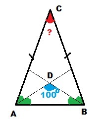 Треугольник АВС равнобедренный, с основанием АВ. Биссектрисы углов при основании пересекаются в точке D. Угол АDB равен 100 градусам. Найти угол С.