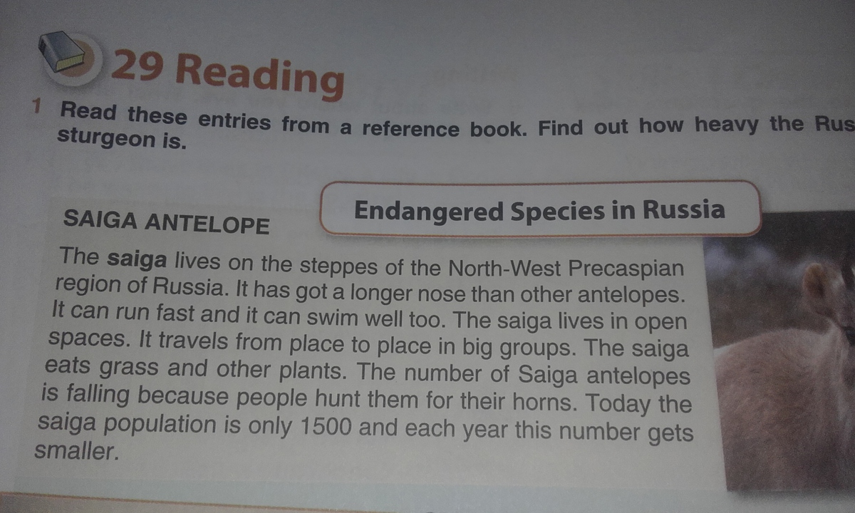 Сайга живет в степях северо западного прикаспийского района Росии. Она имеет более длинный нос чем другие антилопы. Она может быстро бегать и может также хорошо плавать. Сайга живет в открытых постранствах. Она путешествует(перемещается) с место на место большими группами. Сайга ест траву и другие растения. Число антилоп падает потому что люди охотятся за их рогами. Сегодня популяция сайги только 1500 и каждый год их число стпновится меньше.