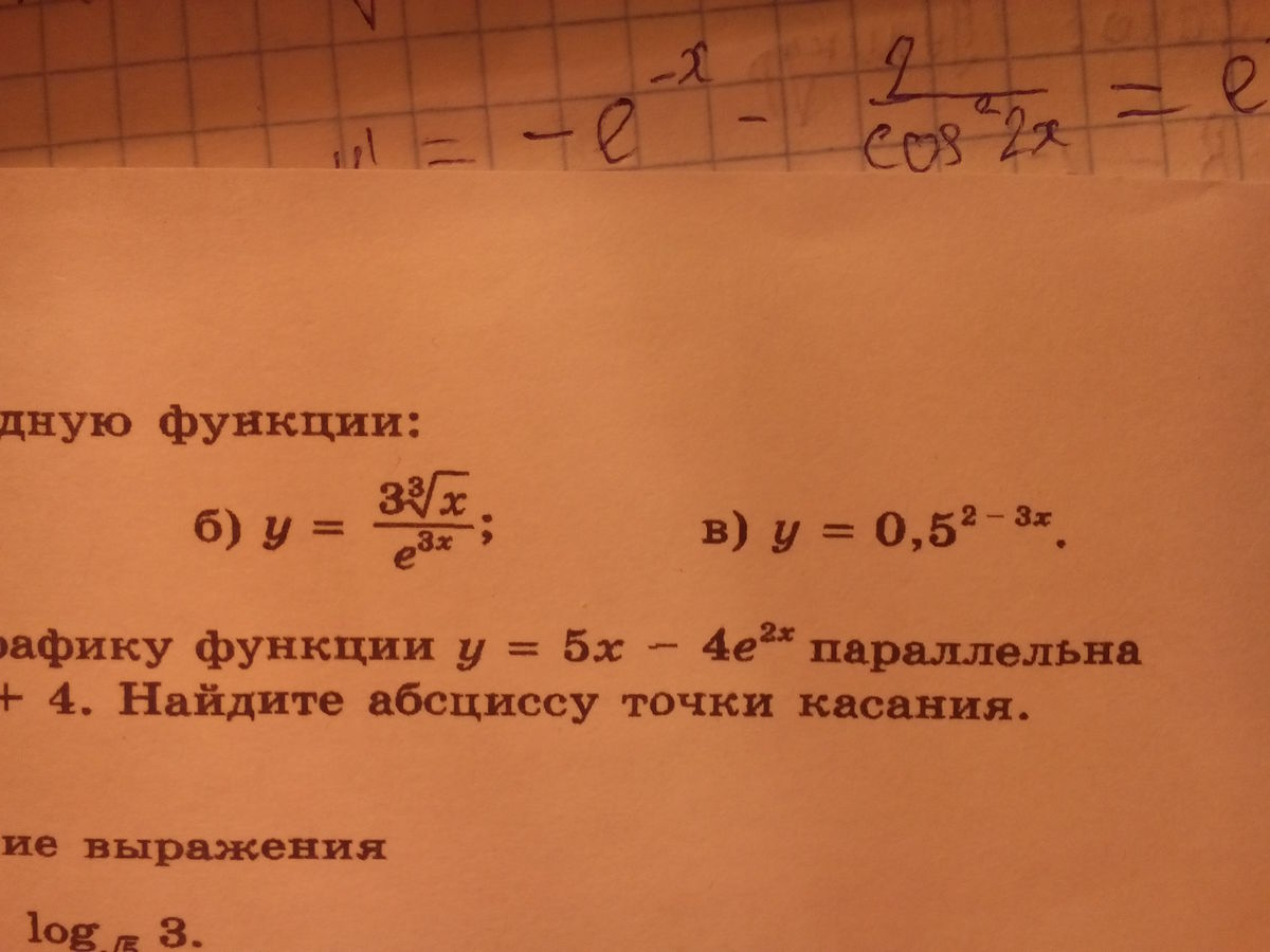 1); ; y= frac{3sqrt[3]{x}}{e^{3x}} \\y'= frac{3cdot frac{1}{3}cdot x^{-frac{2}{3}}cdot e^{3x}-3sqrt[3]{x}cdot 3e^{3x}}{e^{6x}}= frac{x^{-frac{2}{3}}-9sqrt[3]{x}}{e^{3x}} =frac{1-9x}{sqrt[3]{x^2}cdot e^{3x}}\\2); ; y=0,5^{2-3x}\\y'=0,5^{2-3x}cdot ln0,5cdot (-3)=+3cdot ln2cdot 0,5^{2-3x}