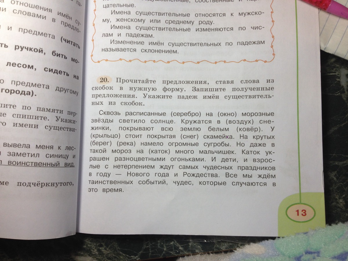 Серебром- Тв. п., на окне- Пр. п., в воздухе - Пр. п., ковром- Тв. п., у крыльца- Р. п., снегом - тв. п., берегах - Пр. п., реки- Р. п., на катке - Пр. п.