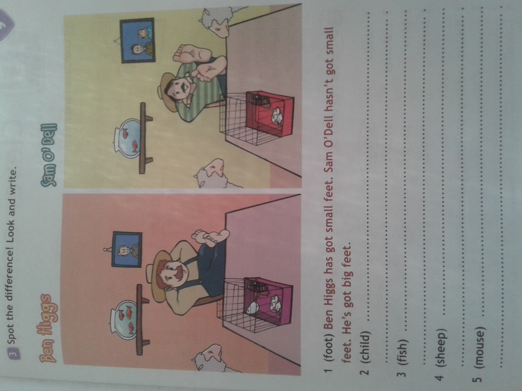 3) Ben Higgs has got three fish. Sam O'Dell hasn't got three fish.