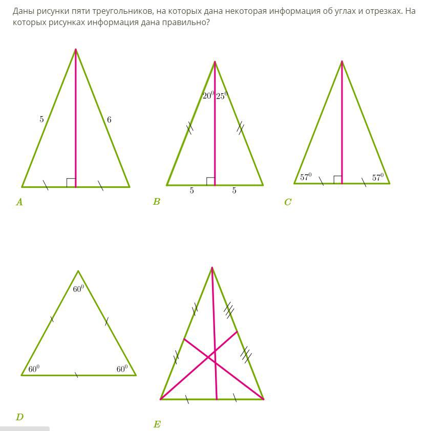 Даны рисунки пяти треугольников, на которых дана некоторая информация об углах и отрезках. На которых рисунках информация дана правильно?