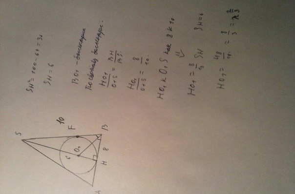 В конус вписана сфера. Образующая конуса равна 10 см, радиус основания 8 см. Найти радиус вписанной сферы. Подробно
