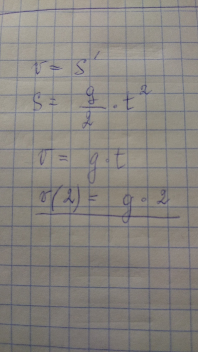 Точка движется по закону s(t)=gt²/2 (свободное падение). Найдите скорость (в м/с) движения точки в момент t=2 с, g=м/c².