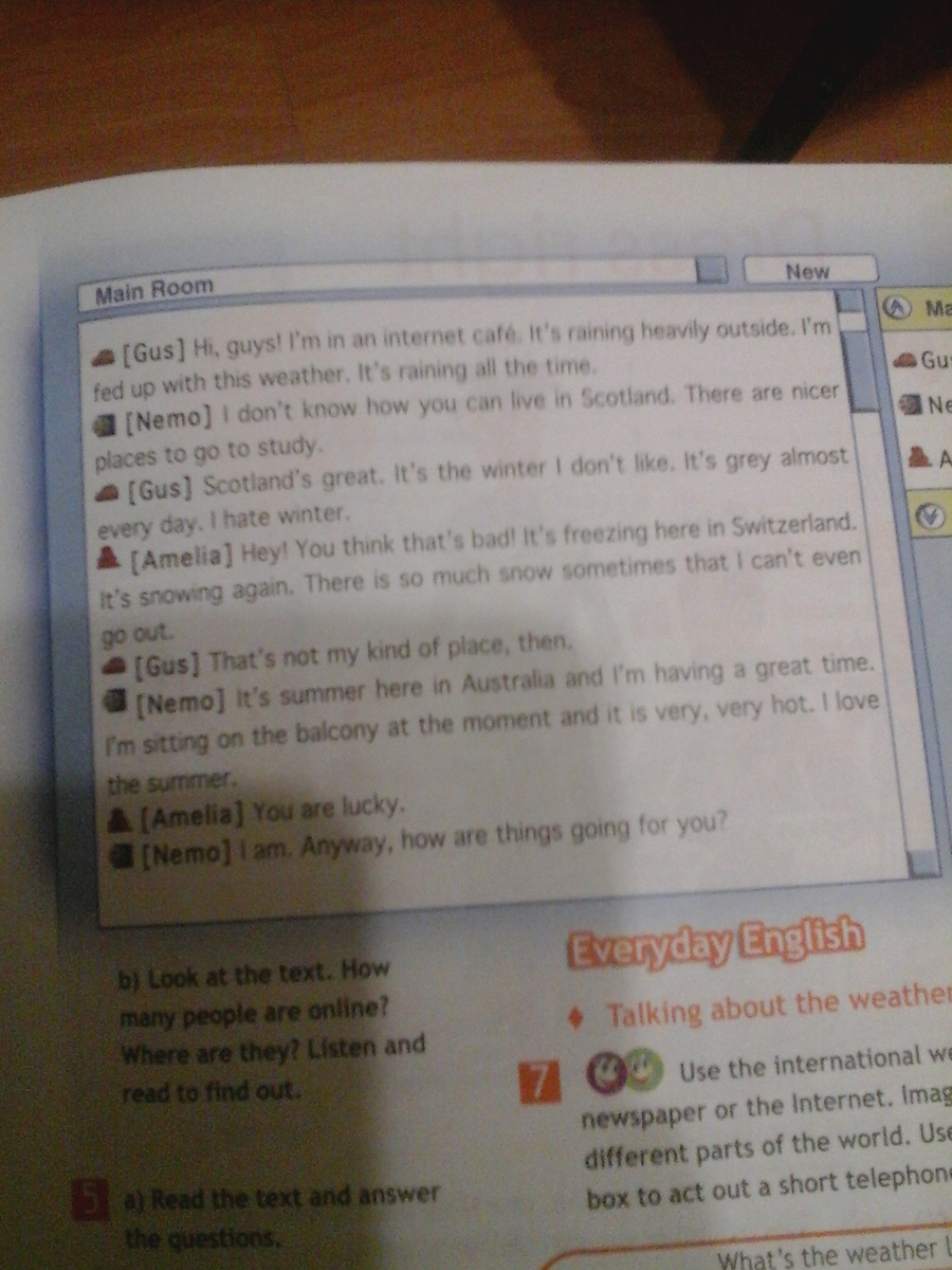 [Гусь] Привет,ребята! Я в интернет кафе. Снаружи идет сильный дождь. Мне надоела эта погода. Дождь идет постоянно.