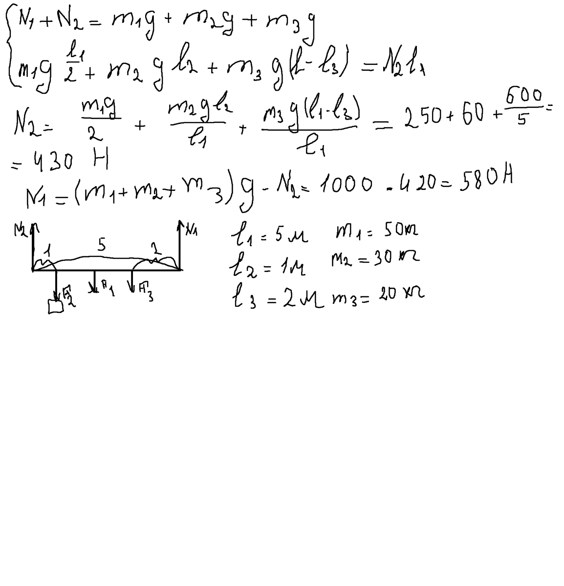 Однородная балка массой 50 кг и длиной 5 м лежит на двух опорах. На балку действуют две силы F1=300 Н и F2=200 Н, точки приложения которых расположены соответственно на расстояниях l1=1м и l2=2м от опор. Определить силы давления балки на опоры
