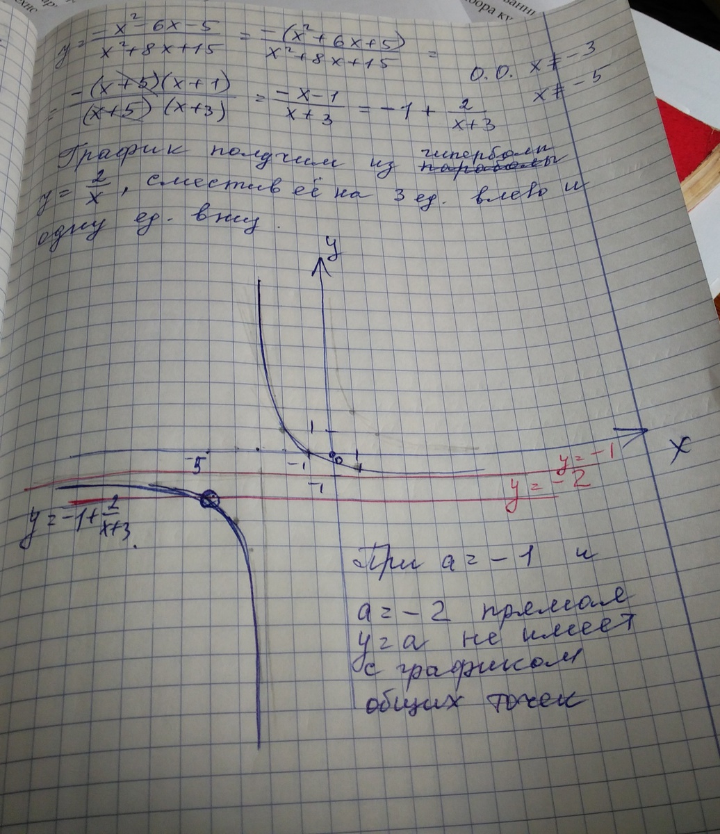 Постройте график функции y=-x^2-6x-5/х^2+8x+15 и определите, при каких значениях параметра а прямая у=а не имеет с графиком общих точек
