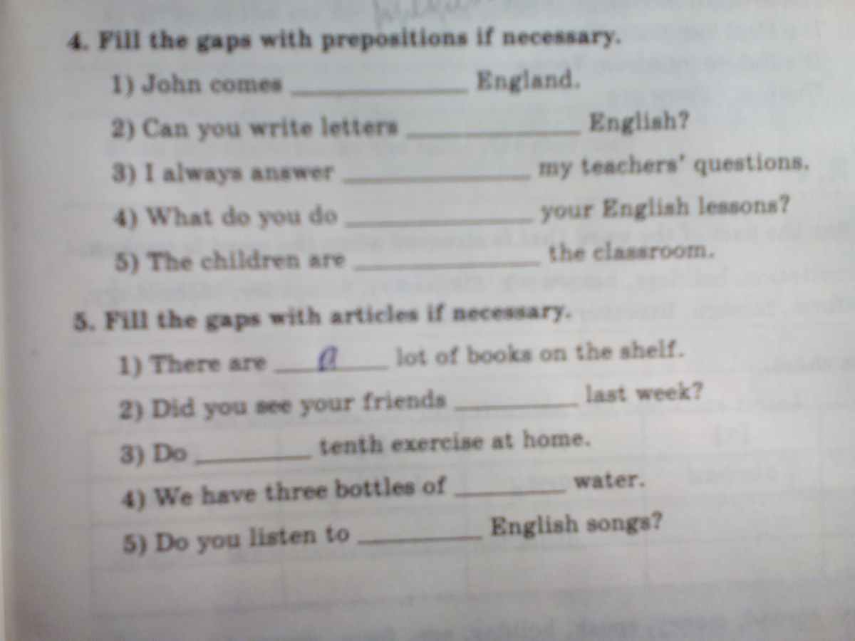 помогите сделать задание 4 или 5 очень нужна помощь надо вставить предлоги или артикли