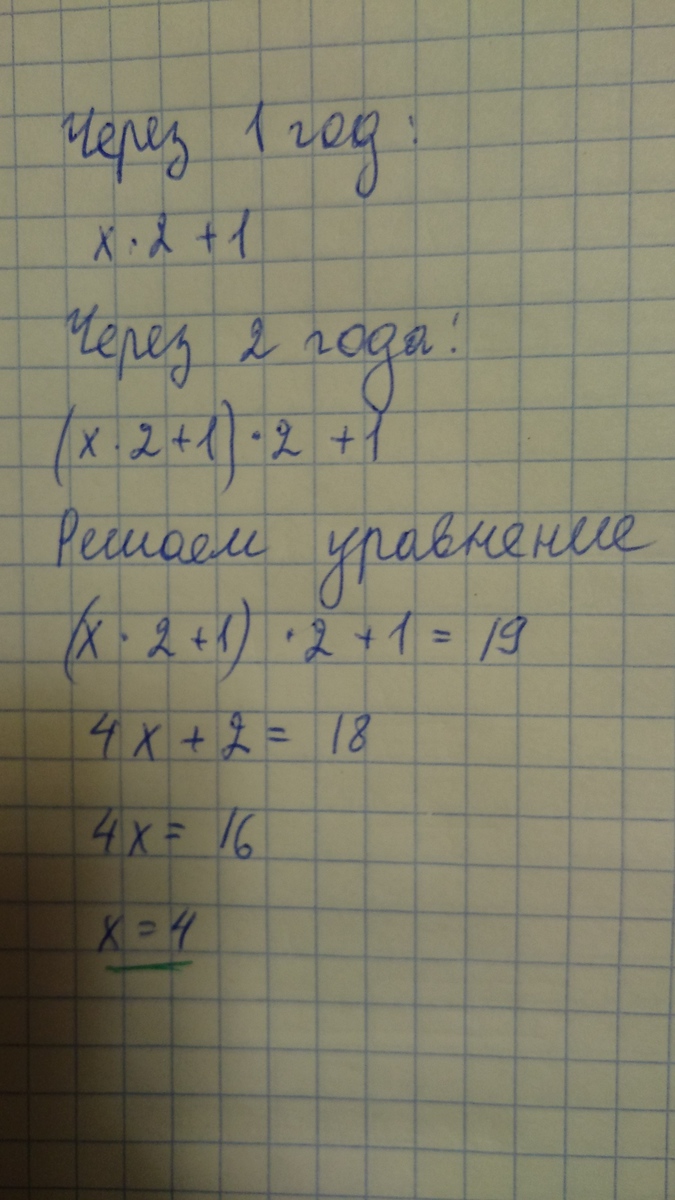 Лиса Алиса и кот Базилио предложили Буратино закопать в землю золотые монеты. Через год он сможет вернуть свои монеты, получив дополнительно столько же и ещё одну монету. Сколько монет должен закопать в землю Буратино, чтобы через два года у него стало 19 монет? Запишите решение задачи и ответ. Помогите пожалуйста решить эту задачу