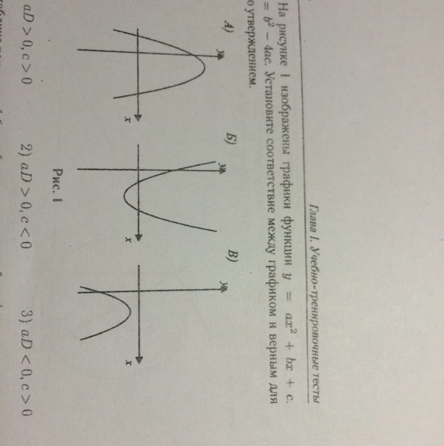 На рисунке 1 изображены графики функции y=ax2+bx+c D=b2-4ac.Установите соответствие между графиком и верным для него утверждением