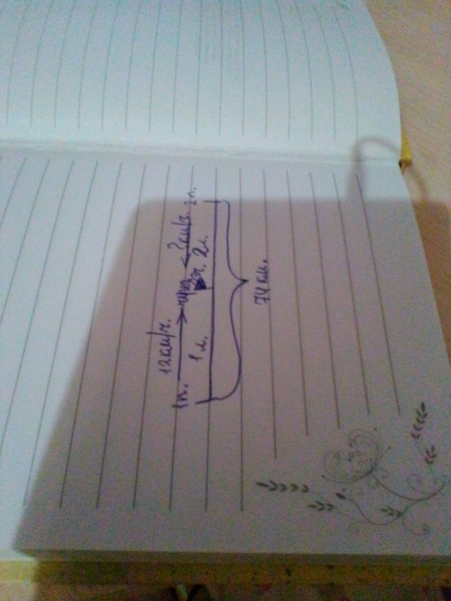 из двух посёлков , находящихся на расстоянии 74км, вышли одновременно навстречу друг другу два лыжника . Скорость первого 12 км|ч . с какой скоростью шёл второй лыжник, если они встретились через 3 часа ?нарисуйте просто схему