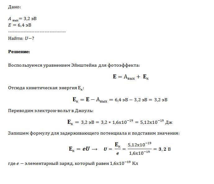 Работы выхода электронов из фотокатода равна 3,2 эВ и фотокатод освещается светом, энергия квантов которого 6,4 эВ. Определите величину задерживающего потенциала, при котором фототок прекратиться.