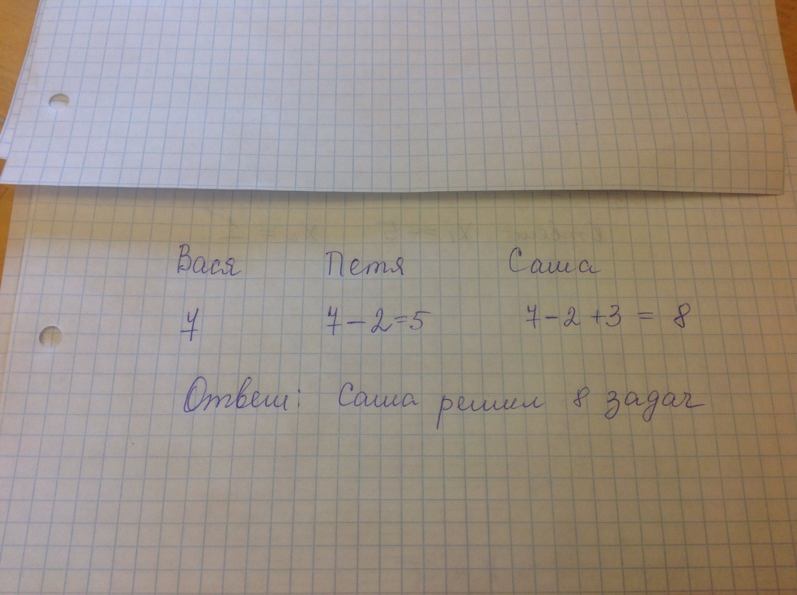 Вася решил на 2 задачи больше, чем Петя,а Петя на 3 задачи меньше, чем Саша.Сколько задач решил Саша,если Вася решил 7 задач?
