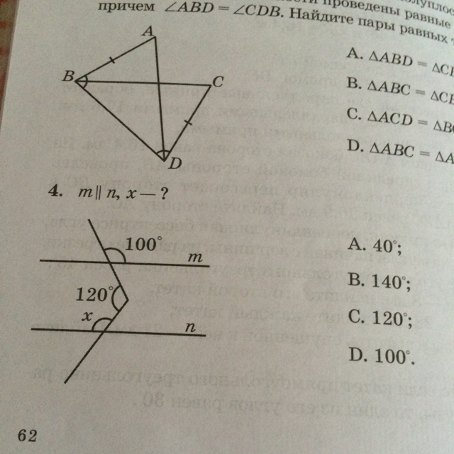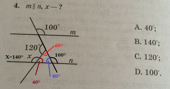 Получаем соответственный угол =100° при параллельных прямых n и m, являющийся внешним для нижнего правого угла образовавшегося треугольника. Тогда внутренний угол этого треугольника, смежный с внешним, будет равен 80°. Второй (верхний) угол треугольника, смежный с данным нам углом (120°), равен 60° (180° - 120°).