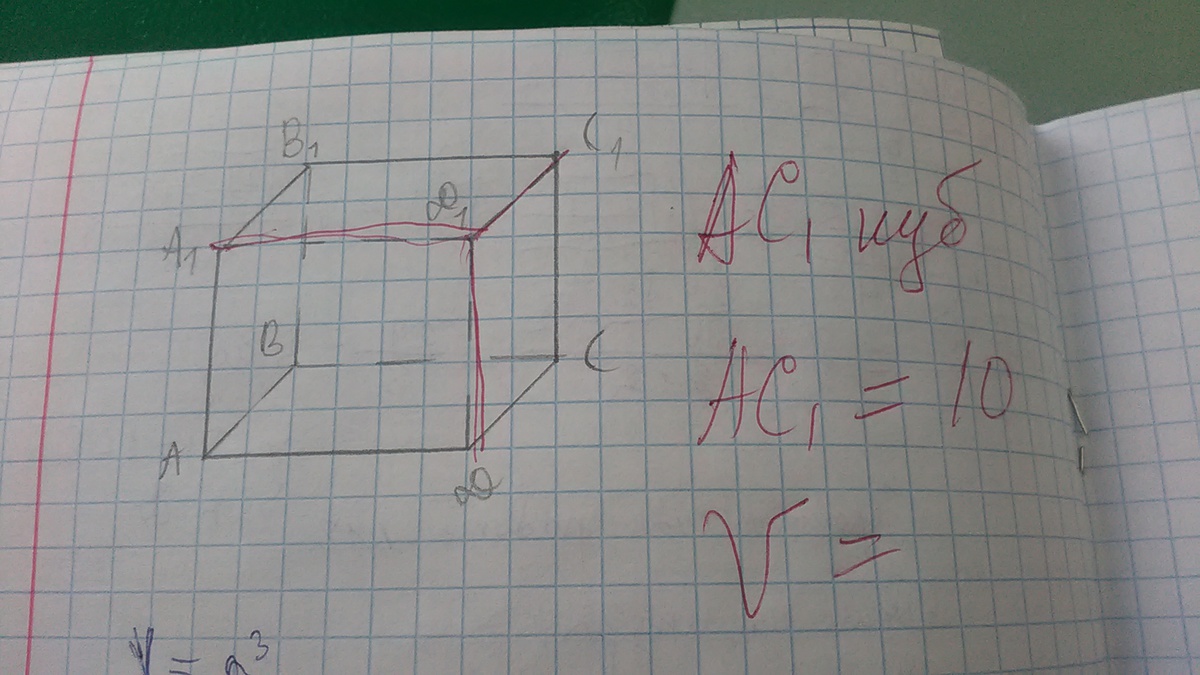 Так как это куб, поэтому все рёбра равны, поэтому обьем куба равен V=a*a*a, где а- сторона куба, поэтому объём равен V=10*10*10=1000