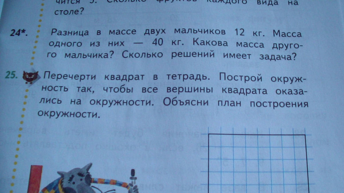 Рисуешь квадрат по клеткам в тетради. проводишь две диагонали и находишь точку их пересечения. берешь в руки циркуль и устанавливаешь иголку в точку пересечения диагоналей квадрата, а грифель устанавливаешь в любой угол квадрата. рисуешь таким положением циркуля окружность. все углы должны точно попасть на окружность если все сделано верно.
