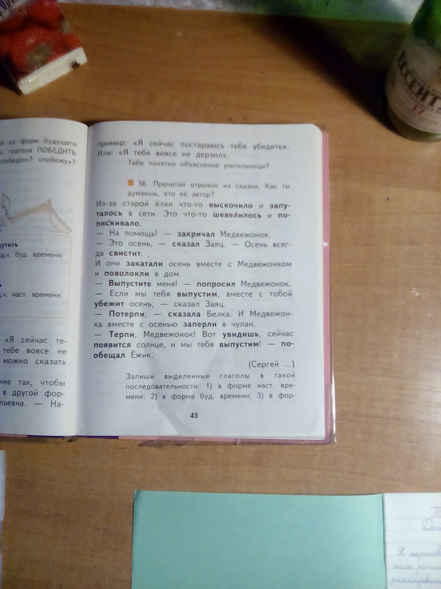 прош. вр- выскочило, заплутало, шевелилось, попискивало,попррсил,сказала,заперли,пообещал;наст.вр-закричал, сказал, свистит, закатали, поволокли,;буд. вр- выпустите, увидишь.