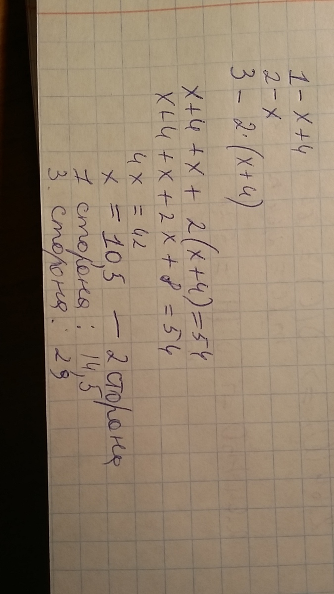 периметр треугольника 54 дм первая сторона в 2 раза меньше чем третья и на 4 дм больше чем вторая найдите стороны треугольника возьмите за х длину второй стороны»