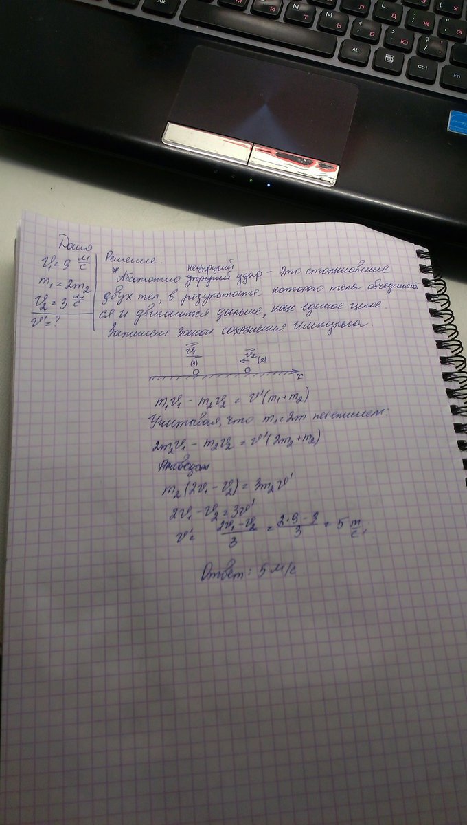 Шар движется со скоростью 9 м/с и сталкивается с другим шаром вдвое большей массы, движущимся со скоростью 3 м/с навстречу первому. Определите скорость шаров после абсолютно неупругого удара. Подробно.