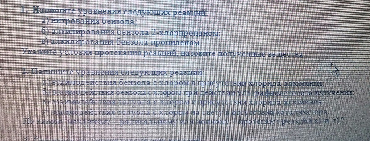 в) C₆H₅--CH₃ + Cl₂→ C₆H₄(Cl)--CH₃