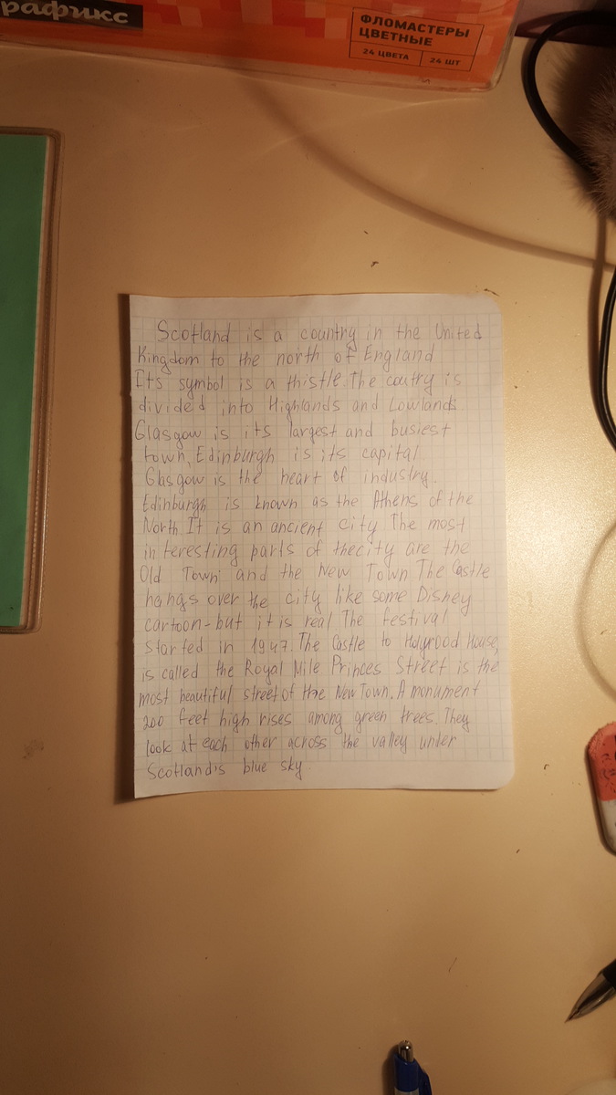 Шотландия это страна в Соединенном Королевстве, на севере Англии. Чертополох это символ Шотландии. Страна поделена на Хайландс и Ловландандс. Глазгоу это самый большой и занятой город, Эдинбург это центр индустрии. Это античный город. Самые интересные части город это Старый город и Новый Город. Дворец парит над городом как в мультиках Диснея-но это реальность. Фестиваль начался в 1947. Замок ... Дом, назывался Роял Мил Принцесс. Улица самая красивая улица Нового Города. Монумент 200 шагов за зеленые деревья. Они смотрят друш на друга через улицу.