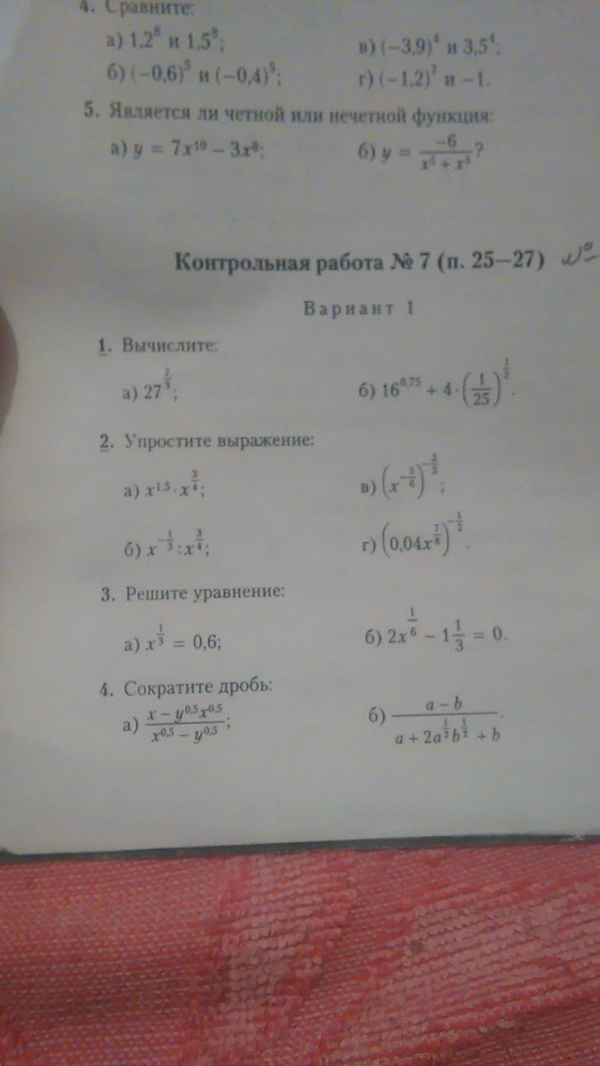 1) а) 27^(2/3)=(3³)^2/3=3²=9; b) 16^0.75+4*(1/25)^1/2=2³+4*1/5=8+0.8=8.8