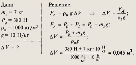 Надувной плот массой 7 кг, удерживает на воде юного рыболова, вес которого равен 380 Н. Минимальный объема плота