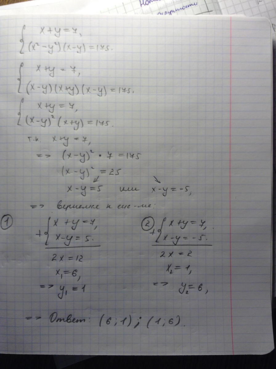 Сначала раскладываешь по формуле: разность квадратов, потом раскладываешь на множители, подставляешь значение х+у=7 и решаешь) вот так)