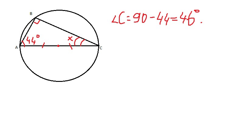 Сторона АС проходит через центр описанной окружности, следовательно - АС - диаметр. Поскольку треугольник АВС вписан окружность, и сторона АС является диаметром, то угол В опирается на дугу в 180 градусов. Вписанный угол В равен половине дуги, на которую опирается: 180/2 = 90 градусов. Сумма углов треугольника равна 180 градусам - это аксиома. Имеем: угол С равен: 180 градусов минус угол А - угол В, или же, для прямоугольного треугольника <C = 90 - 44 = 46 градусов.