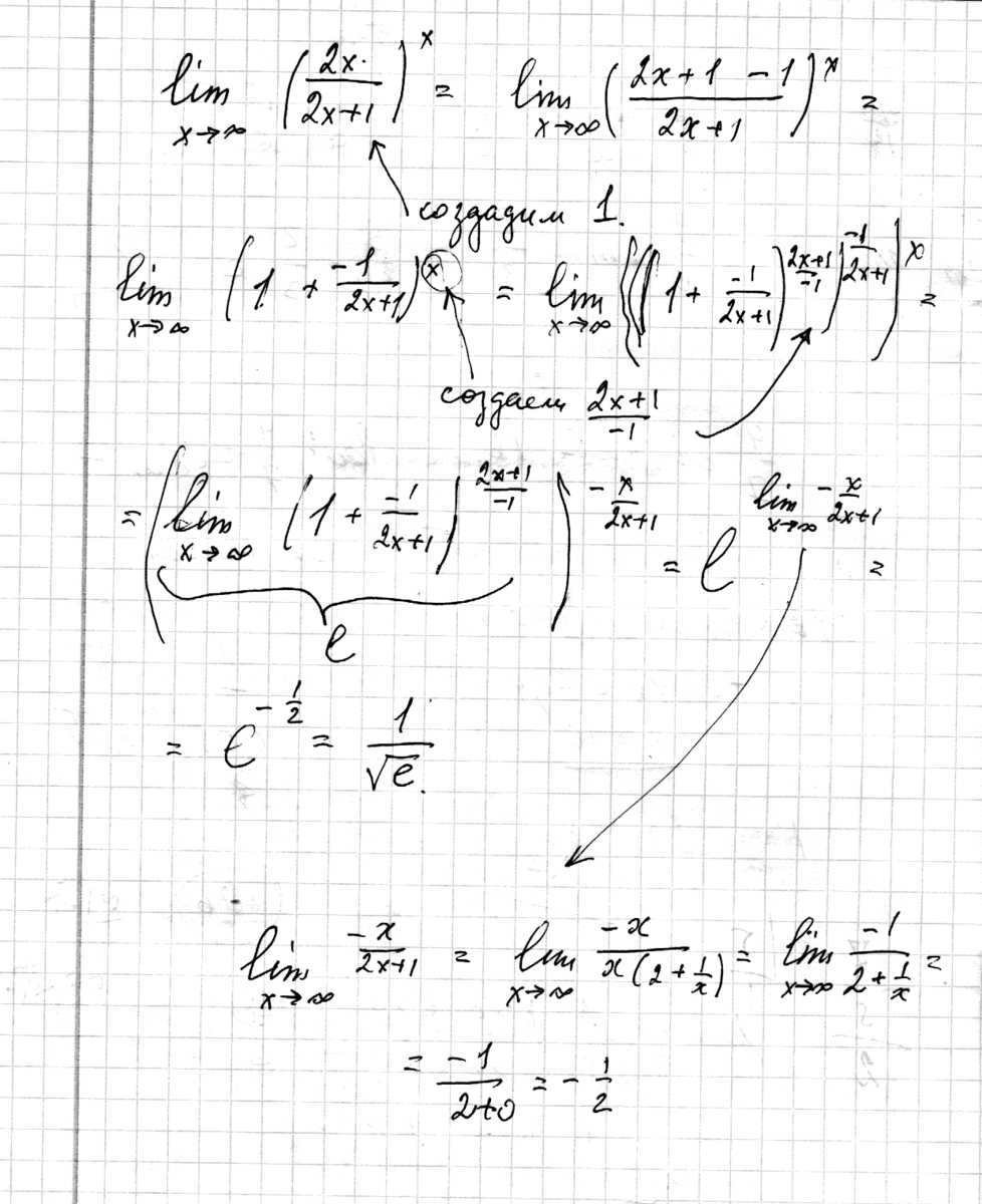 При вычислении таких пределов нужно иметь (1+α)^(1/α).Добавляем показатели так, чтобы показатель не изменился, компенсируем деление умножением
