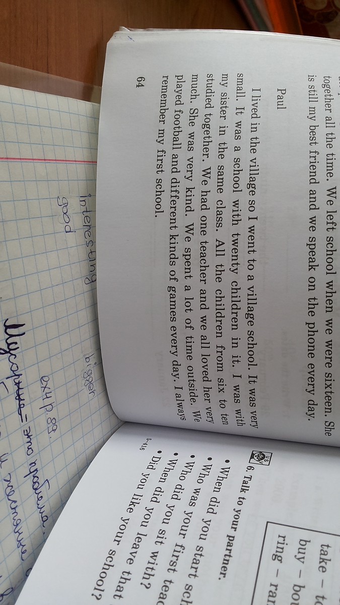 Я жила в деревне и ходила в деревенскую школу. Она была очень маленькая. Это была школа с 12 детьми в ней. Я была с сестрой в одном классе. Все дети с 6 до 10 лет учились вместе. У нас была одна учительница и мы ее очень любили. Она была очень добрая. Мы много времени проводили вне школы. Мы играли в футбол и различные игры каждый день. Я всегда вспоминаю свою первую школу