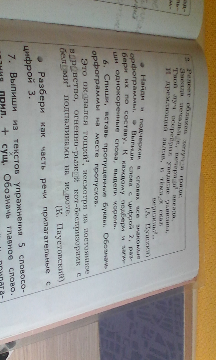 помогите пожалуйста решить номер 6 Спиши Вставь пропущенные буквы обозначь орфограммы на месте пропусков разбери как части речи прилагательное цифрой 3