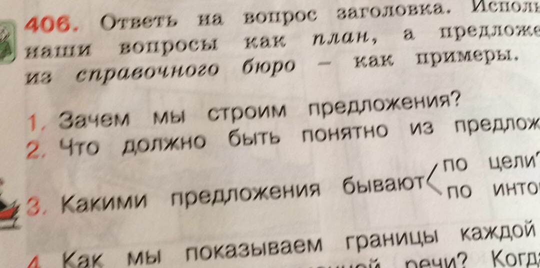5406. Ответь на вопрос заголовка. Инты, наши ‚ОПРООЬ1 как план, а, "ХЛЦЫШЖь из справочного бюро —- как примеры. 1. Зачем мы строим предложения? 2. Что должно быть понятно из предпш/ ' (по цепи’ ЁЗ. Какими предложения бывают по ИНШ А Как мы показываем границы каждой „Мм ночи? Когд