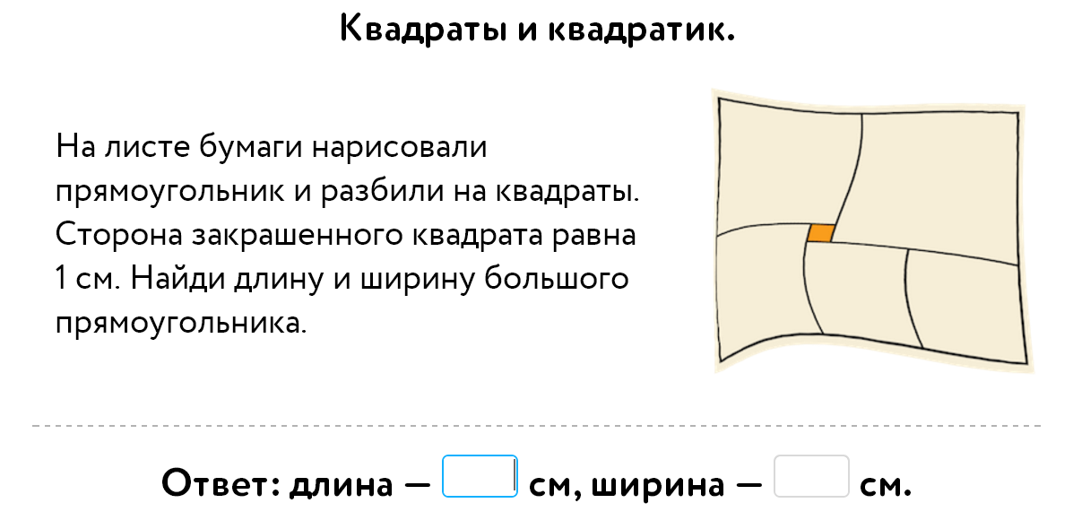 На листе бумаги нарисовали прямоугольник и разбили на квадраты. Сторона закрашенного квадрата равна 1 см. Найди длину и ширину большого прямоугольника.