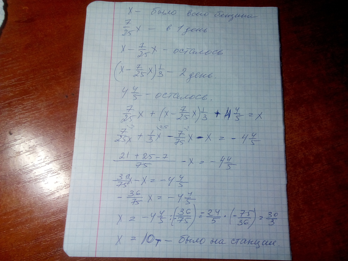 В первый день на заправочной станции было продано 7/25 всего бензина, а во второй день 1/3 остатка. После этого на заправочной станции осталось 4целых 4/5 тонн бензина. Сколько тонн бензина было на заправочной станции первоначально?
