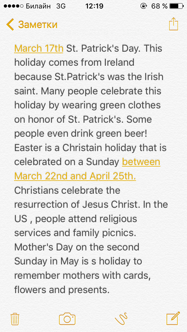 17 марта День Святого Патрика. Этот праздник приходит потому, что из Ирландии Святого Патрика s был ирландским святым. Многие люди празднуют этот праздник, надев зеленые одежды на честь Святого Патрика. ы некоторые люди даже пьют зеленое пиво! Пасха-это христианское праздник, который отмечается в воскресенье между 22 марта и 25 апреля христиане празднуют воскресение Иисуса Христа. В США, люди посещают религиозные службы и семейные пикники День Матери во второе воскресенье мая-это праздник вспоминать матерей с картами цветов и подарков