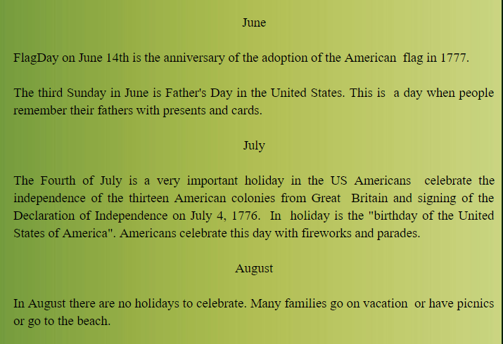 День флага 14 июня это годовщина принятия флага в Америке в 1777 году. Третье воскресенье июня это день отца в Соединенных Штатах. Это день,когда люди вспоминают своих отцов дарят им подарки.