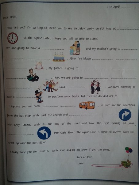 (1) Seven o'clock (2) party (3) bake a cake (4) candles (5) say a toast (6) have fun; dance (7) magician (8) by bus (9) turn right (10) left