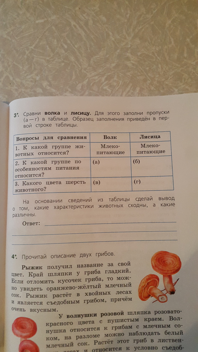 Вывод: Волк и лисица относятся к группе млекопитающие, питаются мясом. Шерсть у волка серая, а у лисицы рыжая.