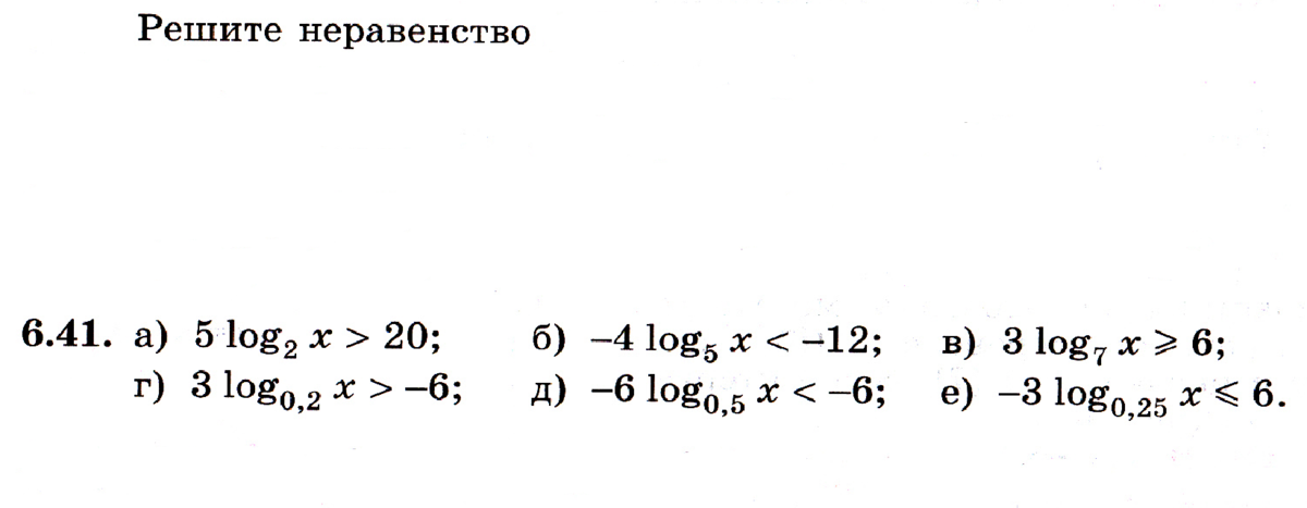 5log_2x textgreater  20; ,; log_2x textgreater  4; ,; x textgreater  2^4; ,; x textgreater  16\\ -4log_5x textless  -12; ,; log_5x textgreater  3; ,; x textgreater  5^3; ,; x textgreater  125\\-6log_{0,5}x textless  -6; ,; log_{0,5}x textgreater  1; ,; x textless  0,5\\-3log_{0,25}x leq 6; ,; log_{0,25}x geq -2; ,; x leq 0,25^{-2}; ,; x leq (frac{1}{4})^{-2}; ,; x leq 16\\3log_7x geq 6; ,log_7x geq 2; ,; x geq 7^2; ,; x geq 49\\3log_{0,2}x textgreater  -6; ,; log_{0,2}x textless  -2; ,; x textgreater  0,2^{-2}; ,; x textgreater  25