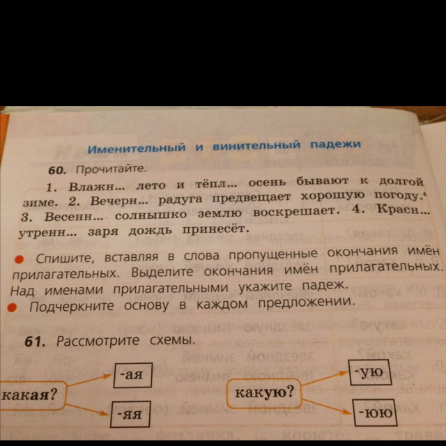 влажное окончание ОЕ И.п., тёплая окончание АЯ И.п., вечерняя окончание ЯЯ И.п., весеннее окончание ЕЕ И. п., красная окончание АЯ И.п., утренняя окончание ЯЯ И.п.