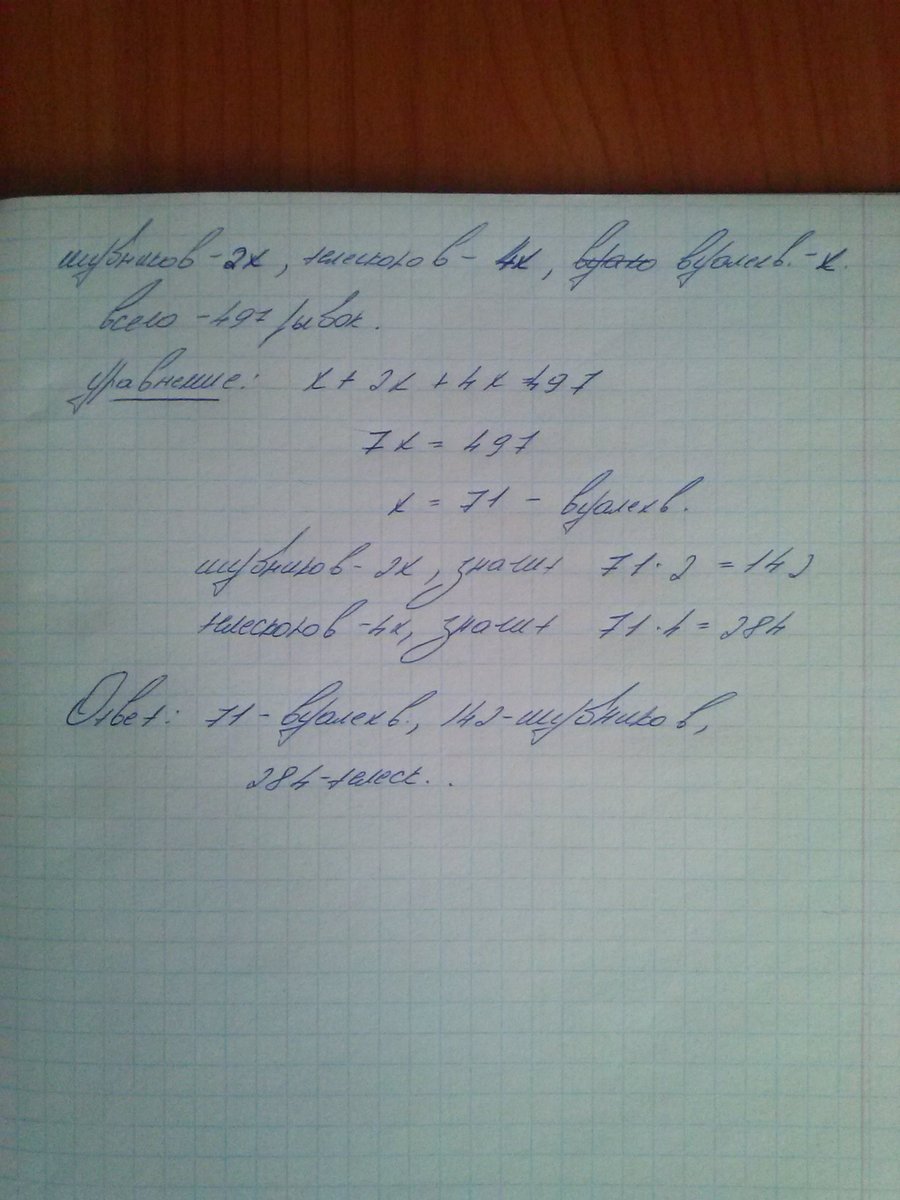 В зоомагазине 497 золотых рыбок. Среди них шубункинов вдвое, а телескопов вчетверо больше, чем вуалехвостов. Сколько в зоомагазине золотых рыбок каждого вида?